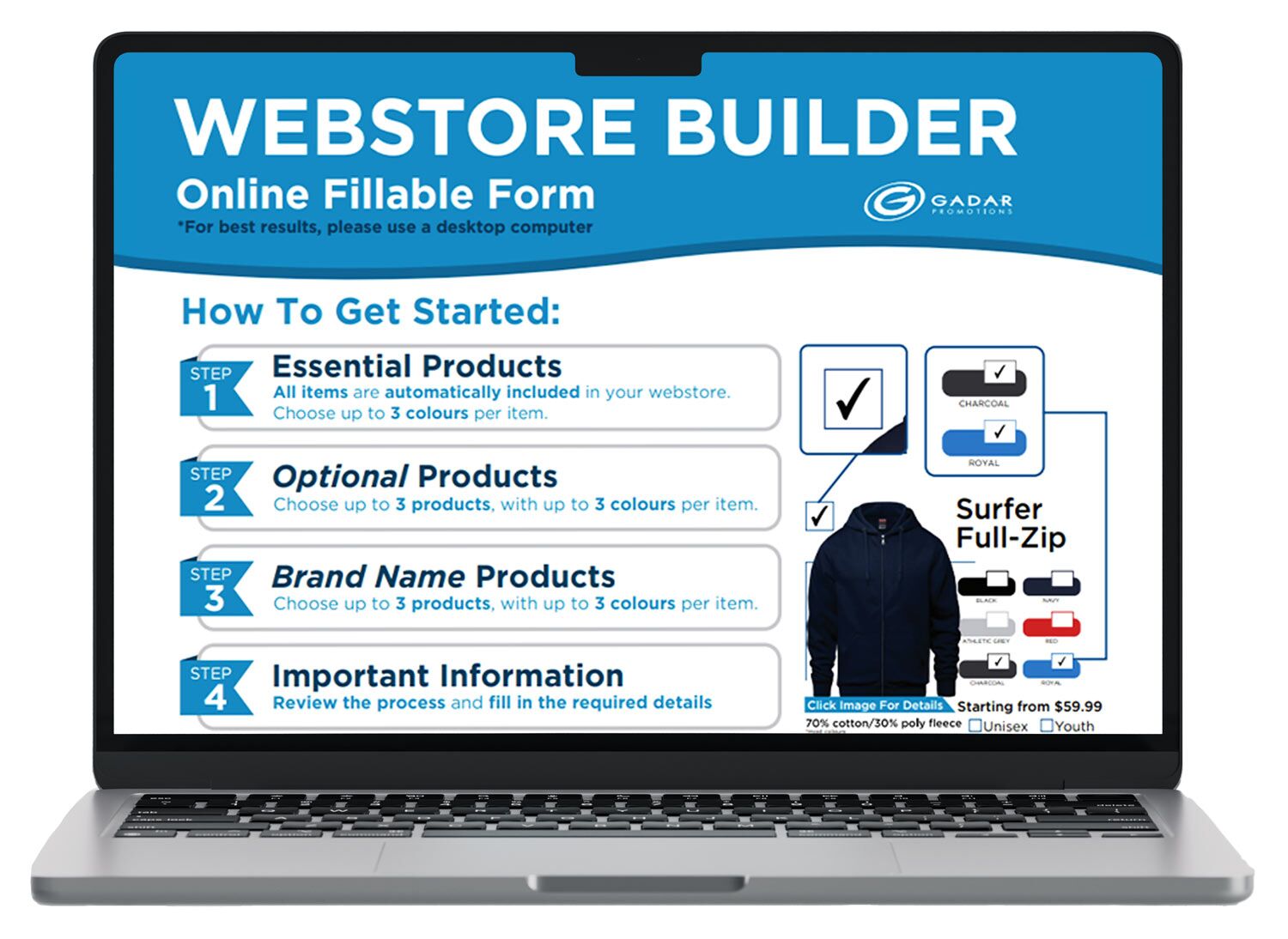 Input your desired garments, colours and accessories into the Web Builder PDF above for your organization category